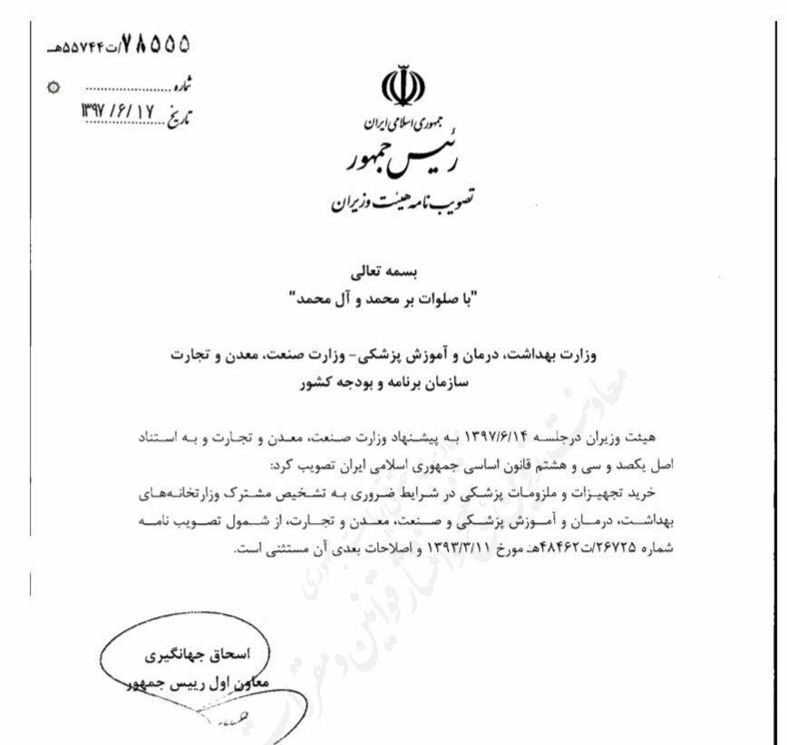 اسحاق جهانگیری معاون اول رئیس جمهور در این ارتباط با ارسال تصویب نامه هیئت وزیران به وزارت بهداشت، درمان و آموزش پزشکی، وزارت صنعت، معدن و تجارت و سازمان برنامه بودجه اعلام کرد: هیئت وزیران در جلسه ۱۴ شهریور ۹۷ به پیشنهاد وزارت صنعت، معدن و تجارت و اصل یک صد و سی و هشتم قانونی اساسی تصویب کرد: خرید ملزومات و تجهیزات پزشکی در شرایط ضروری به تشخیص وزارت بهداشت، درمان و آموزش پزشکی و وزارت صنعت، معدن و تجارت از تصویب نامه شماره ۲۶۷۲۵ ت ۴۸۴۶۲ و اصلاحات بعدی آن مستثنی است.